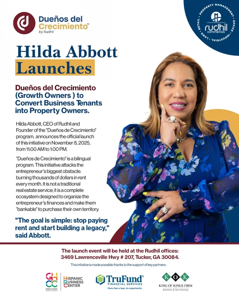 Tucker, GA — RudHil Commercial, en colaboración con la Cámara de Comercio Hispana de Georgia (GHCC), TrueFund Financial Services y King of Kings, anuncian con orgullo el lanzamiento oficial de la iniciativa “Dueños del Crecimiento / Growth Owners” y la ceremonia de inauguración de la nueva oficina de RudHil Commercial en Tucker, GA.